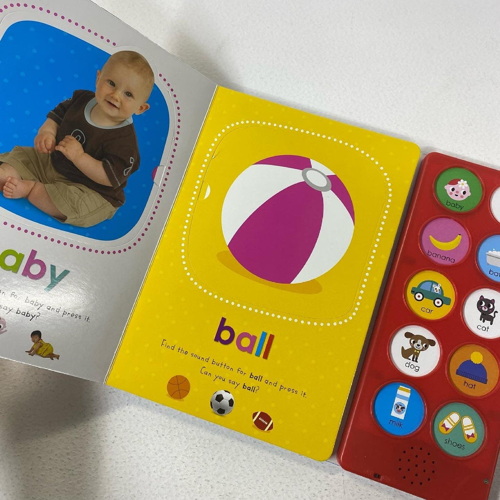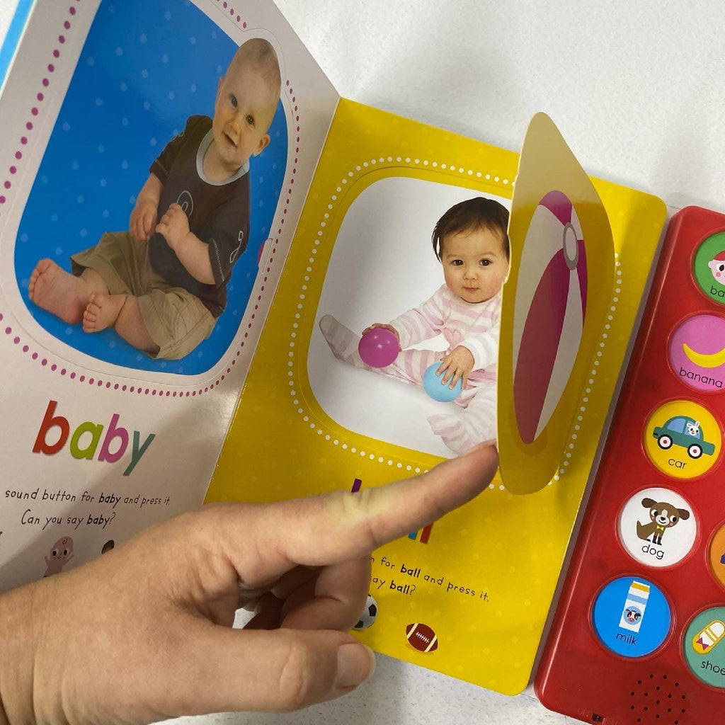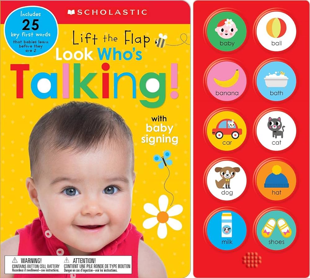 Look Who's Talking! is a multi-button sound book with flaps to link pictures, words, and baby signing.