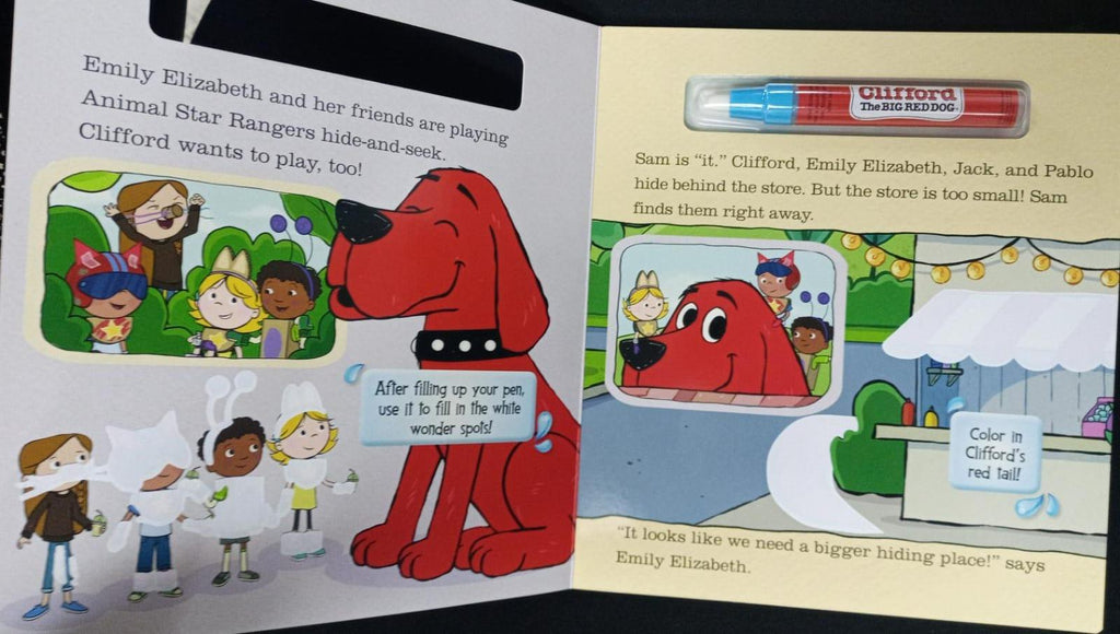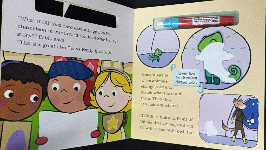 When Emily Elizabeth finds a book about animal camouflage, she gets a brilliant idea for the best way for Clifford to hide... Use the water pen to color in different scenes and animals in the story.
