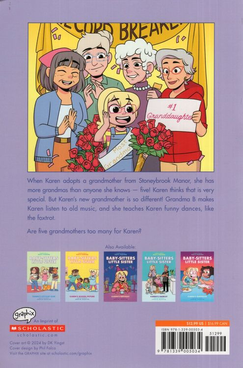 When Karen adopts a grandmother from Stoneybrook Manor, she has more grandmas than anyone she knows -- five! Karen thinks that is very special. But Karen's new grandmother is so different! Grandma B makes Karen listen to old music, and she teaches Karen funny dances, like the foxtrot.