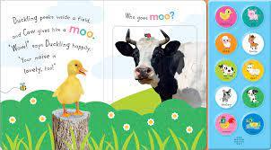 Look Who's Mooing! is a multi-button sound book with flaps to link pictures, words, and animal sounds.