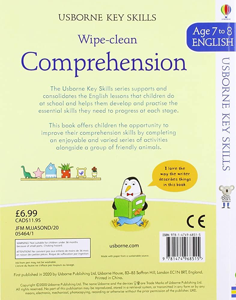 This book is packed with enjoyable activities designed to develop skills in reading, understanding and interpreting different styles of writing. Guided by a group of friendly animals, children will gain confidence as they work their way through the activities, which include writing lists, diaries, poems and stories, and analysing a piece of writing. All activities reinforce English teaching in schools, and reflect the National Curriculum. There is a practice page and ‘secret’ notes for grown-ups in a gatefold at the back of the book. Comes with a special wipe-clean pen which is very satisfying to write with, and easy to wipe. Part of the hugely successful Usborne Wipe-clean series, the Key Skills titles teach children the basics of a variety of Maths, English and Science topics.