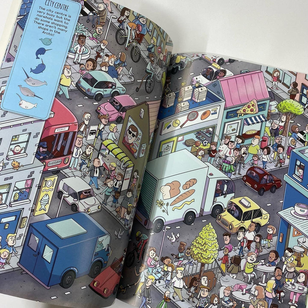 From a trip to the museum and a day out at a water park, to a tropical beach and icy waters, there's so much to spot and find, including a bonus rainbow narwhal! Plus, see if you can find the odd animal out in fun activity pages.