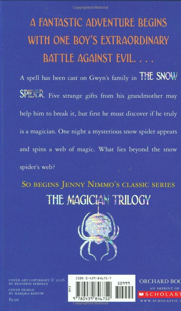 On Gwyn's 9th birthday, his grandmother tells him he may be a magician, like his Welsh ancestors. She gives him five gifts to help him--a brooch, a piece of dried seaweed, a tin whistle, a scarf, and a broken toy horse. One blustery day, unsure what to do with his newfound magic, Gwyn throws the brooch to the wind and receives a silvery snow spider in return. Will he be able to use this special spider to bring his missing sister, Bethan, home? THE SNOW SPIDER spins an icy, sparkly web of mystical intrigue that sets the stage for the next two books in this outstanding trilogy!