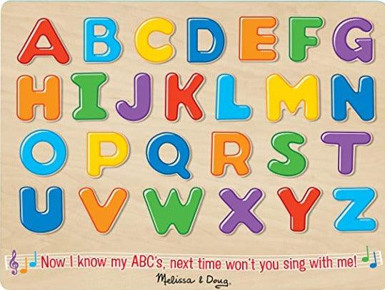 - See and hear the alphabet with this 26-piece wooden Alphabet Sound Puzzle with brightly colored uppercase letters