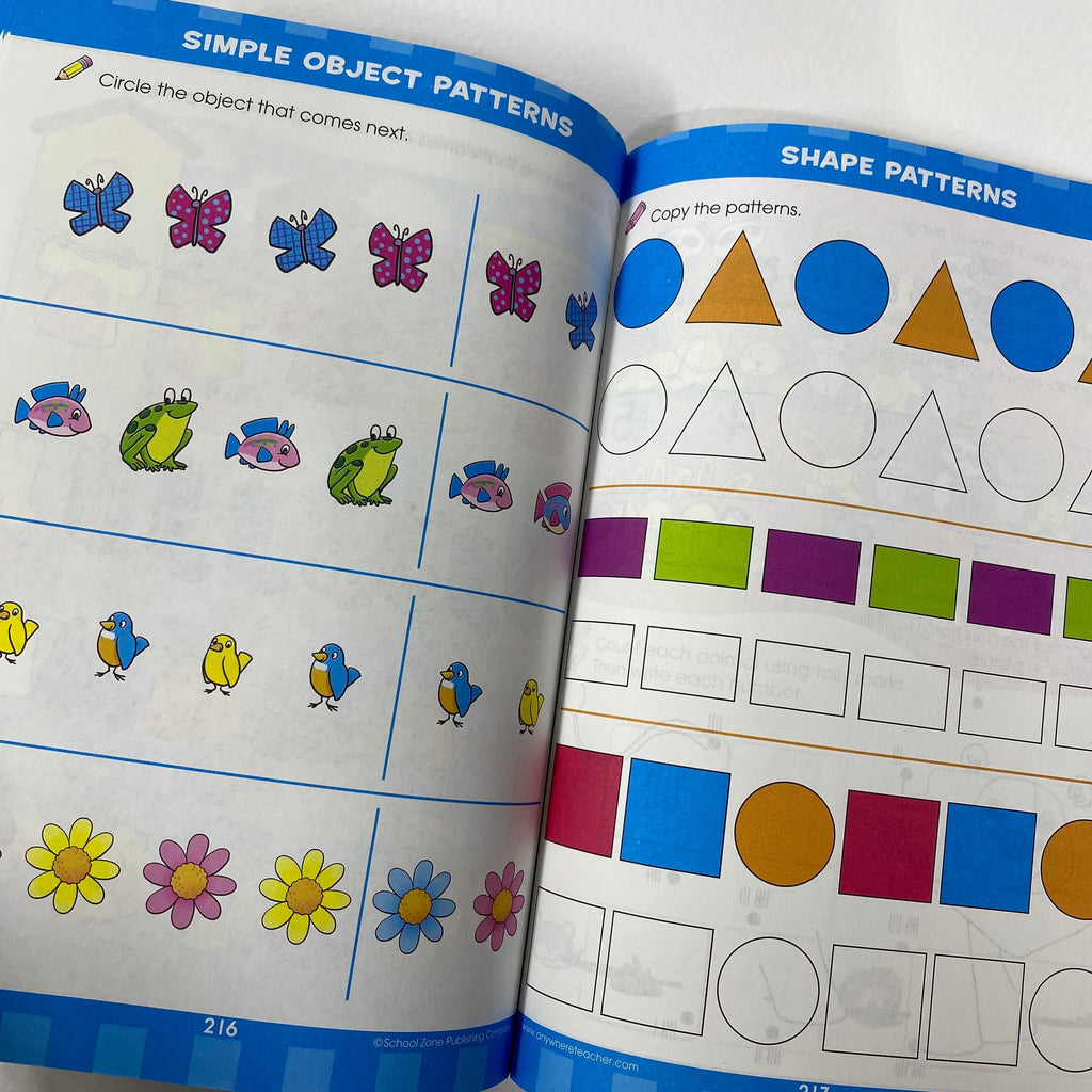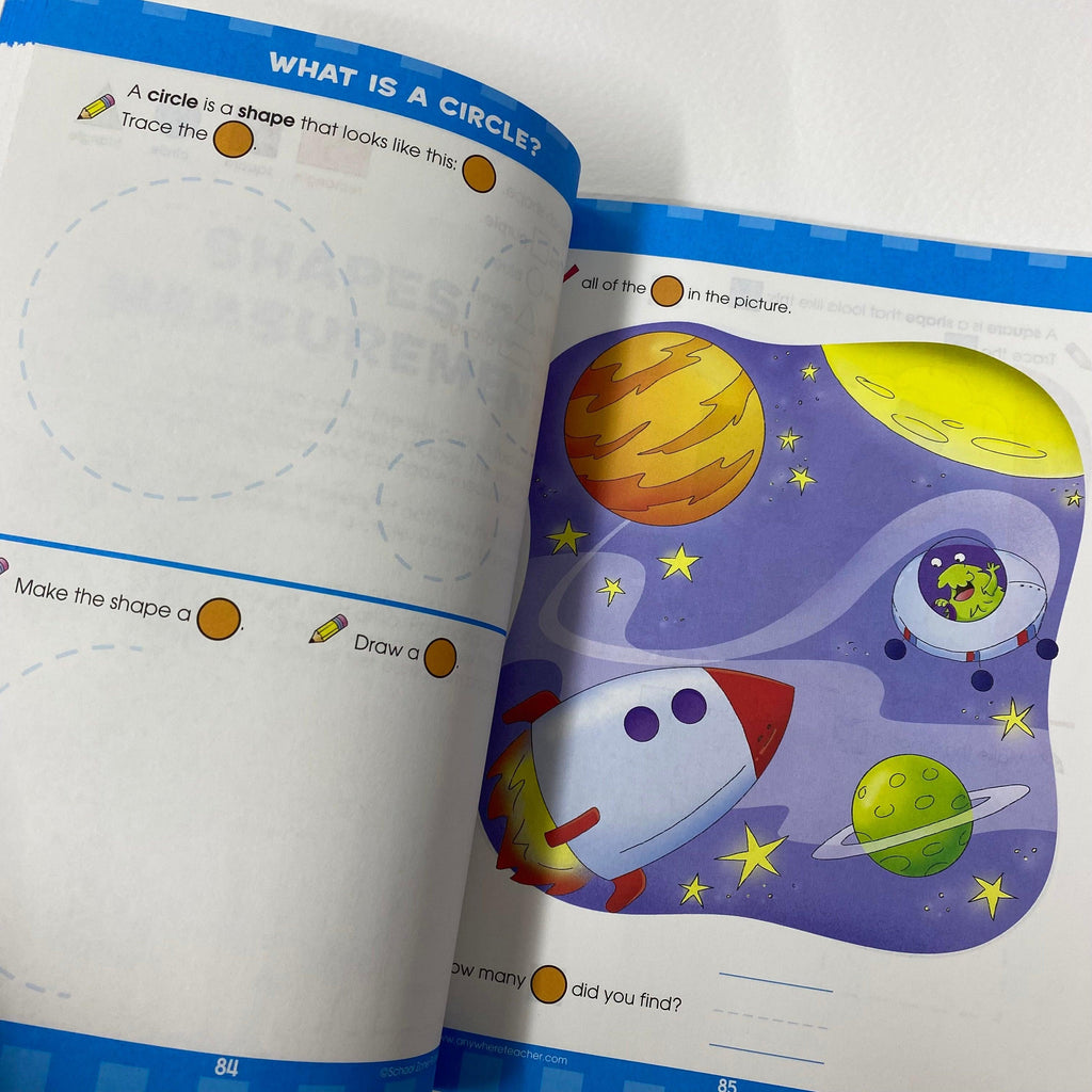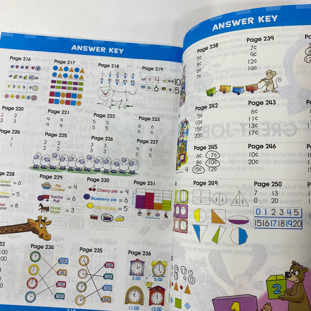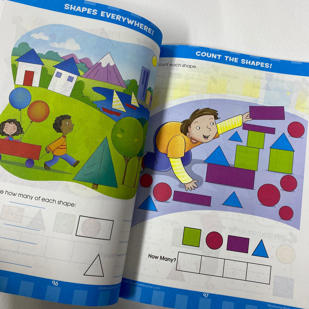 This isn’t just a kindergarten math workbook, but also an early reading workbook that teaches with sight words kids can easily follow. Kids can also build skills in the alphabet, numbers 0 to 20, reading readiness, writing, sequencing, story order, following directions, contrasting, classifying, grouping, relating words and pictures, and play a fun and informative matching game!